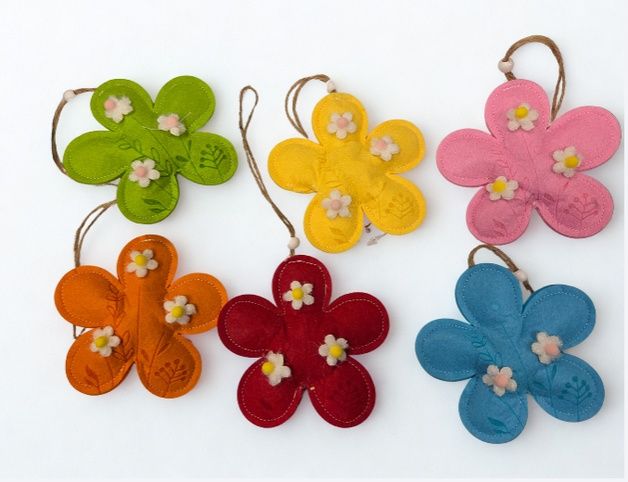 Roztomilá ručně působící dekorace ve tvaru květiny rozzáří každý interiér. Květina je vyrobena z kvalitního filcu, zdobená jemnou výšivkou listů a drobnými 3D kvítky s plastickým středem. Díky jutovému provázku s dřevěným korálkem ji snadno zavěsíte na věšák, kliku, větvičku nebo jako jarní či velikonoční ozdobu.