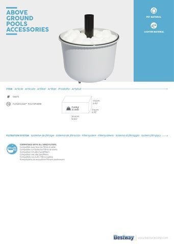 Jednoduchá manipulace a čištění. Materiál 100% PET. Vhodné pro všechny stávající pískové filtrace od Bestway. Nízká hmotnost pro snadnou manipulaci. Vynikající výsledek a účinnost filtrace. Dlouhá životnost.