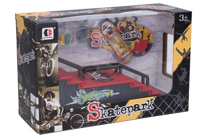 Fingerboard sada se schody. Rozměry schodů 23,5x10x9,5 cm, velikost fingerboardu 9,5 cm. Obsahuje: schodiště se zábradlím, 1x kompletní fingerboard, 4 náhradních koleček, 2 náhradní šroubky, 2 náhradní matice, šroubovák, klíč.