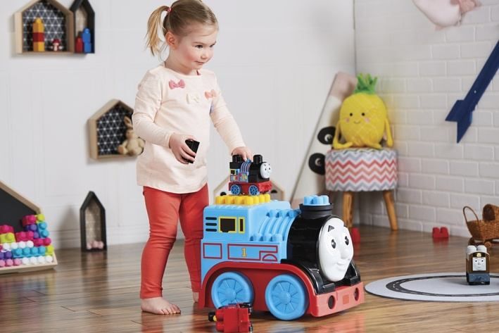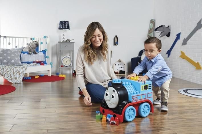 Stavění kostek, počítání a spojování barev a obrázků! To vše a ještě více čeká na všechny malé strojvůdce s touto velkou lokomotivou Tomášem.