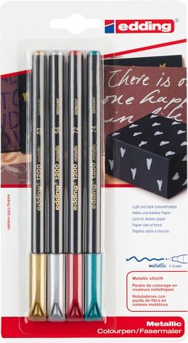 Metalické fixy edding 1200 s inkoustem na bázi vody využijete pro zdobení papíru. Fixy jsou obzvlášť vhodné jsou pro dekorativní psaní na tmavý papír (pohlednice, přáníčka, jmenovky, vzkazy). Napsaná stopa je světlostálá. Kulatý hrot. Šíře stopy: 1-3 mm. Balení obsahuje 4 metalické barvy: stříbrnou, zlatou, červenou a tyrkysovou. Baleno v blistru. Vyrobeno v Německu.
