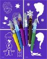 Balení obsahuje 6 barevných foukacích fixů s potiskem a 4 barevné papírové šablonky v oblíbených pohádkových motivech.