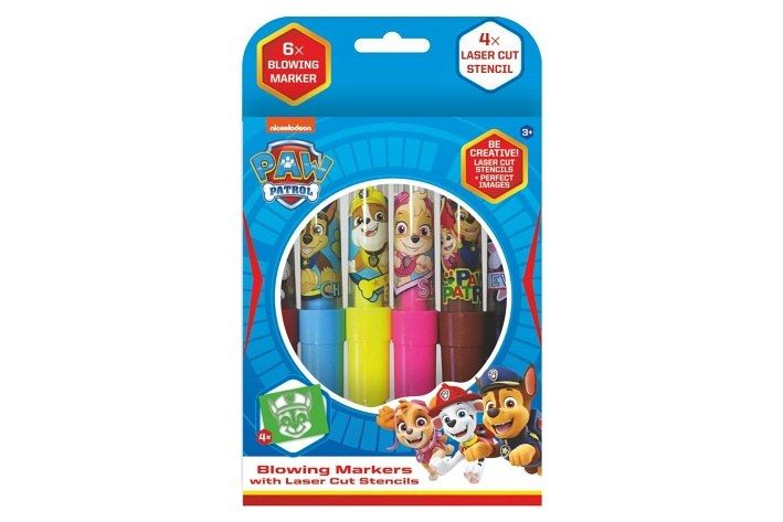 Balení obsahuje 6 barevných foukacích fixů a 4 barevné papírové šablonky v oblíbených pohádkových motivech Tlapkové patroly.