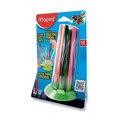 Fixy Color'Peps 12 barev v inovativním a zároveň atraktivním patentovaném stojánku, díky kterému již nebudete ztrácet víčka připevněná k měkké základně. Kompaktní řešení zároveň šetří místo a stojánek je možné snadno přenášet.
