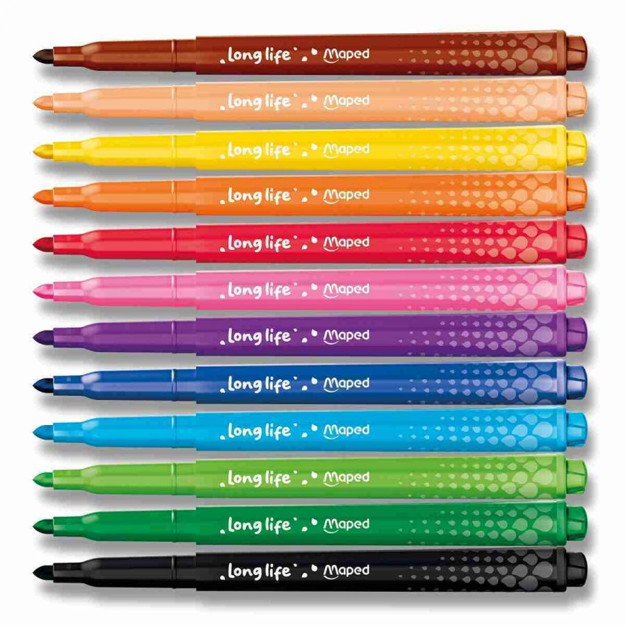 Souprava 12 kusů barevných fixů Maped Long Life 2.0 se snadno vypratelným a omyvatelným inkoustem. Trojúhelníkový úchop pro lepší a pohodlnější držení.