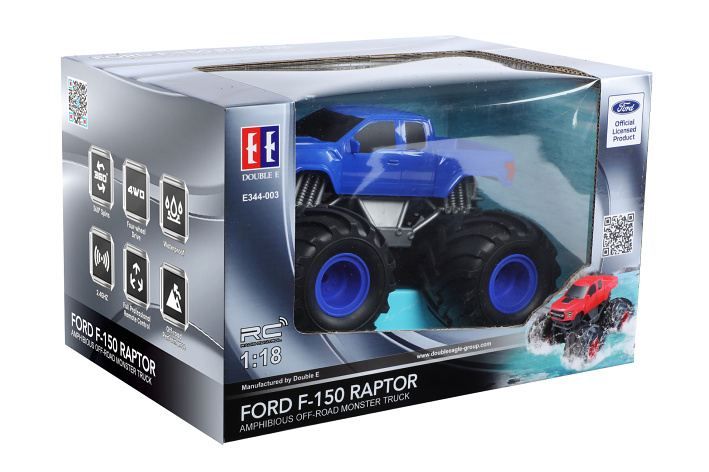 Ford F-150 Raptor Monster Truck plavací modrý RC na dálkové ovládání. Rozměry 20,2x17,2x13,2 cm. Frekvence 2. 4GHz. Bateriový pack 3. 7V 500mAh do auta součástí, 2xAA do ovladače nejsou součástí. Tlačítko (přepínač) ON/OFF na spodní straně auta. Ovladač - pohyb dopředu a dozadu, otáčení vlevo a vpravo, přepínač ON/OFF, 2 tlačítka pro trimování kol. Doba nabíjení 3 h.