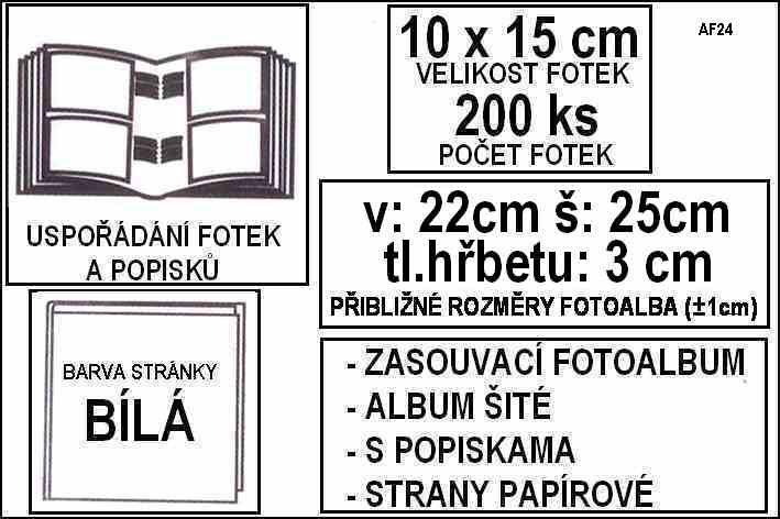 - FOTOALBA, rámečky / PODROBNÉ TŘÍDĚNÍ / 10x15cm / 200 kusů fotografií / S popiskama fotek / 2 kusy fotek nad sebou / Popisky vedle fotek / Album šité v:22 š:25 h:3 (AF24)