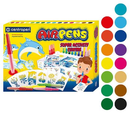 Sada foukacích fixů s vnitřní náplní- určeny na papír - zdravotně nezávadný inkoust, snadno smývatelný a vypratelný- ventilační chránítko, po použití řádně uzavřít- balení obsahuje 15 kusů foukacích fixů, 14 + 2 šablony různých motivů, 20 archů A4 a 20 archů A5- mix barev