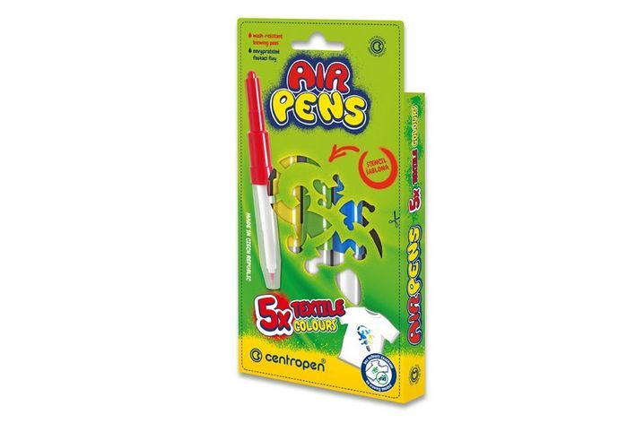 Sada foukacích fixů s vnitřní náplní, které jsou určeny na textil. Náplně obsahují zdravotně nezávadný inkoust. Kresby odolají praní do 60°C. Ventilační chránítko, po použití řádně uzavřít. Balení obsahuje 5 kusů foukacích fixů a 1 šablonu.Mix barev