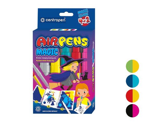 Sada magických foukacích fixů s vnitřní náplní, které jsou určeny na papír- náplně obsahují zdravotně nezávadný inkoust přebarvitelný zmizíkem- ventilační chránítko, po použití řádně uzavřít- balení obsahuje 5 kusů foukacích fixů, 1 klasický zmizík a 8 šablon