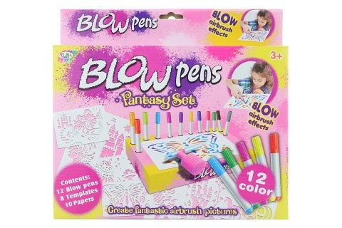Velká sada foukacích fixů obsahuje lepenkový podstavec a držák na fixy, 12 barevných fixů, 8 šablon, 6 papírů a nástavec na foukání s pumpičkou. Rozměry balení cca 30 x 27 x 5 cm. Věk 3+