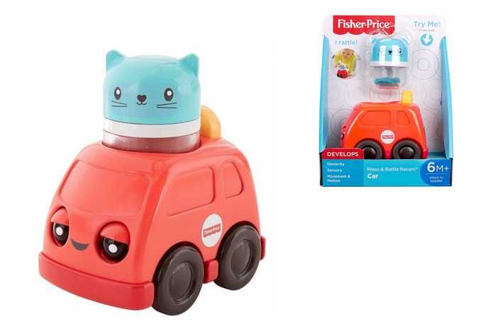 Zažijte spoustu zábavy s tímto malým autíčkem, které je vhodné pro malé ručičky dítěte. Když váš malý závodník stiskne modrou kočičku na sedadle řidiče, světlomety (oči) automobilu se otevřou.