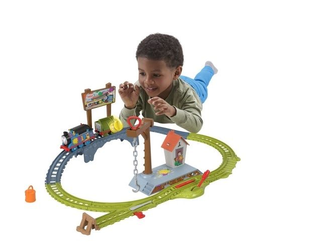 Děti předškolního věku mohou poslat svého dobrého kamaráda Tomáše uhánět přes stanici Wayland, aby vyzvedl a doručil barvu, s touto sadou motorizovaného vláčku a kolejí Mašinka Tomáš Dodávka barev od Fisher-Price®. Přepnutím spínače na horní části mašinky