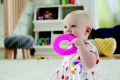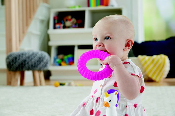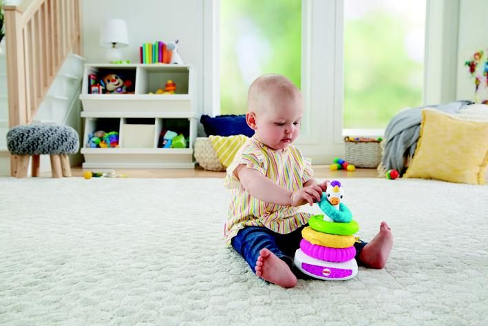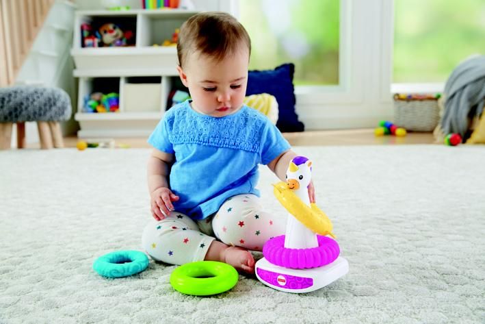 Třešničkou na dortu je roztomilý jednorožec a houpavá podstava, která zacinká pokaždé, když do ní vaše děťátko plácne. Díky kombinaci zářivých barev, zajímavých povrchů a veselého cinkání budou smysly vašeho drobečka neustále zásobeny různými vjemy a ještě si při tom užije spoustu zábavy! Skládáním kroužků na sebe a plácáním do podstavy navíc zlepší svoji koordinaci zraku s pohyby rukou a procvičí i své drobné tělíčko.