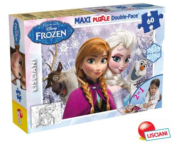 Lisciani Frozen Puzzle MaxiFloor 60 oboustranné 2v1. Oboustranné puzzle, 60 dílků. Rozměry 70 x 50 cm. Obrázek Elsa a Anna. Přední strana s barevným obrázkem, na zadní straně předkreslený k vymalování.
