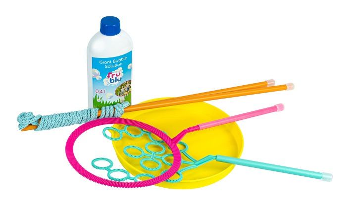 FRU BLU Deluxe set obsahuje šňůru pro obrovské bubliny, velkou obruč, "stromek" s 12 obručemi, nádobku na tekutinu i 0,4L tekutiny.Bubliny FRU BLU dosahují obrovských rozměrů a mají neskutečné tvary. Září všemi barvy duhy. Bubliny FRU BLU vznikají díky speciální tekutině, která je produkovaná v EU. Jsou trvanlivé a jen tak neprasknou.