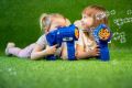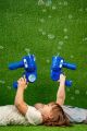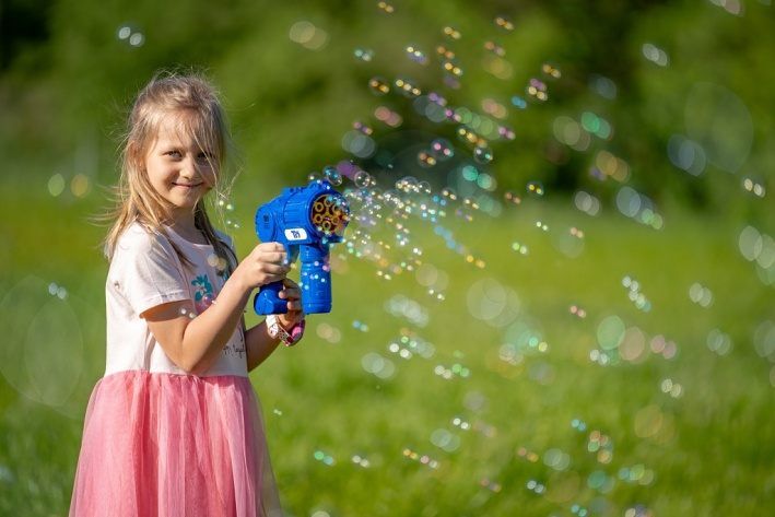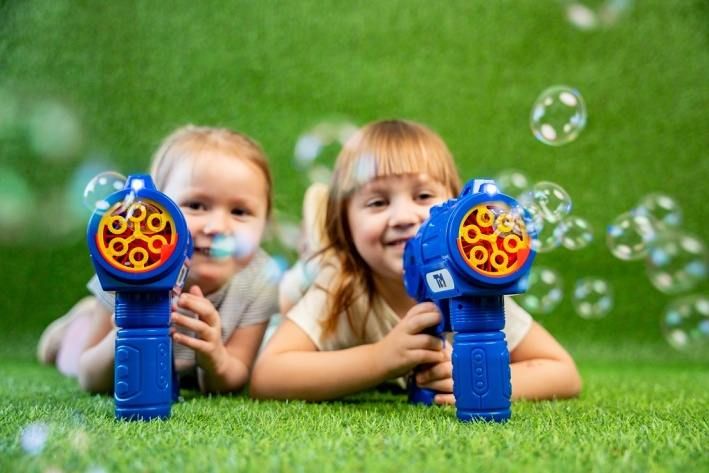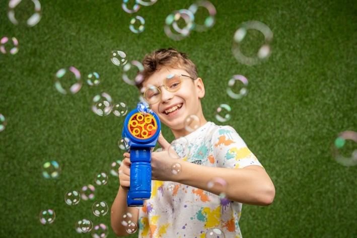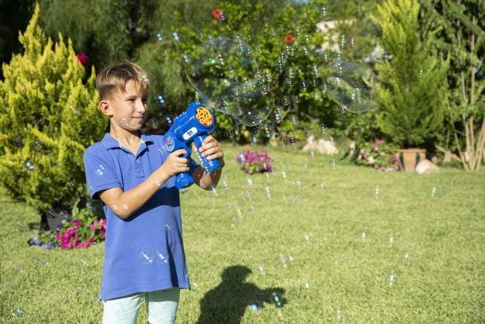 Automatický bublifuk Fru Blu je navržen jako zábavná pistole, která dokáže rychle a efektivně vytvořit velké množství drobných bublin. Celý přístroj je vyroben z pevného modrého plastu s výraznými žlutými a červenými detaily na přední části, kde se bubliny tvoří. Díky ergonomicky tvarované rukojeti je držení hračky pohodlné i pro malé děti. Na boku je umístěno kulaté logo Fru Blu, které přidává na atraktivitě výrobku. Bublifuk je poháněn třemi AA bateriemi, které nejsou součástí balení, a během provozu poskytuje světelné efekty, jež zvyšují zážitek z hravé činnosti. Součástí sady je také 0,4litrová náplň na tvorbu bublin, která je balena v plastové láhvi s modrým uzávěrem a barevným štítkem s motivem bublin a dětských postaviček. Náplň je určena k výrobě malých bublin, které jsou díky speciální receptuře pevné a dlouho vydrží ve vzduchu. Tento set je vhodný pro děti od tří let a představuje ideální venkovní aktivitu, která podporuje pohyb a radost z hry na čerstvém vzduchu. Bublifuk Fru Blu je oblíbený zejména díky své schopnosti vytvářet velké množství bublin najednou, což je na fotografiích znázorněno při hrách dětí venku na trávníku. Děti si užívají jak samostatnou hru, tak i společné soutěžení, kdy bubliny létají všude kolem. Hra s tímto bublifukem podporuje rozvoj motoriky a zároveň přináší spoustu zábavy. Díky kombinaci světelných efektů a velkého množství bublin je tato hračka ideální volbou pro letní dny i různé oslavy či venkovní akce. Celkově je Fru Blu sada bublinová střílečka s náplní praktickým a zábavným produktem, který nabízí jednoduché a rychlé použití, bezpečnost pro děti a vysoký vizuální efekt díky barvám a světelným funkcím. Tento bublifuk je skvělým doplňkem pro každou dětskou zahradu nebo volnočasové aktivity. Na baterie: 3x AA (nejsou součástí balení)