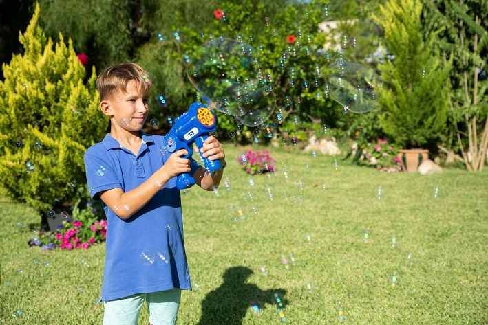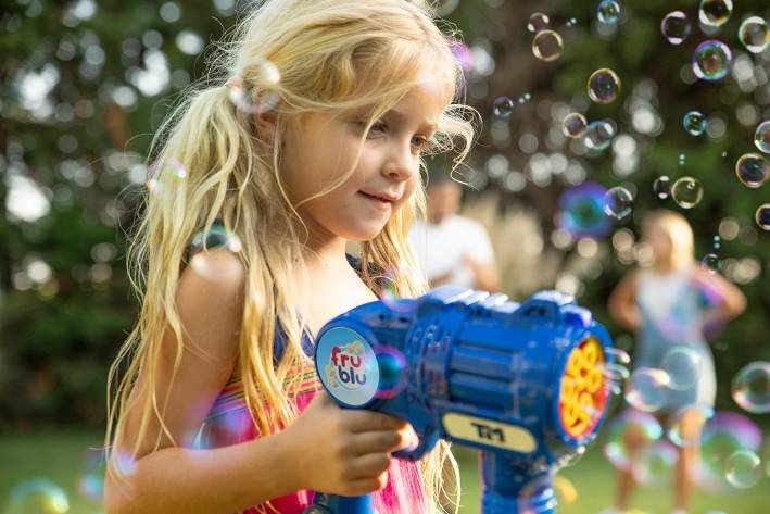 Mega blaster Fru Blu střílí velikou rychlostí obrovské množství bublin a poskytuje tak vašemu dítěti hodiny zábavy. Bubliny jsou osvětleny LED lampou, která zdůrazňuje jejich jedinečné barvy. Snadné použití a nádoba na tekutinu odolná proti rozlití, dělá z foukání bublin skvělou aktivitu pro starší i mladší děti. Sada obsahuje Mega blaster a láhev s náplní o objemu 0,4L. Potřebné baterie: 4 x AA Baterie nejsou součástí balení. Hračka je určena pro děti od 3 let