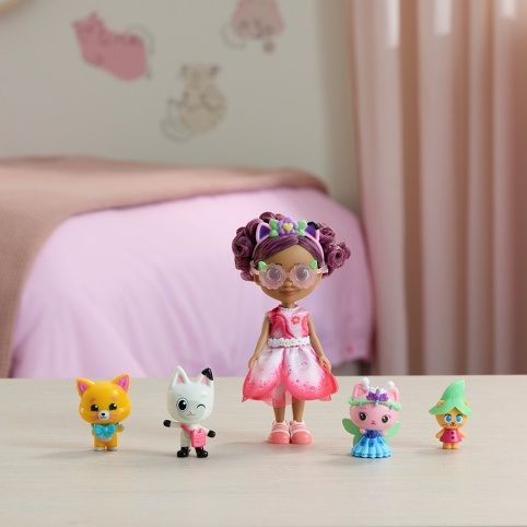 Vstupte do světa Gábinina kouzelného domku ve filmu s filmovou sadou figurek Královny Víly Kočičky a Kočičího skřítka! Obě figurky měří přes 5 cm a mají veselé doplňky, jako je připevnitelná drahokamová korunka s popínavým lístkovím pro Královnu Vílu Kočičku a listová čepice pro Kočičího skřítka. Tyto roztomilé kočičí hračky zvou k mňau-úžasnému objevování a podporují hravé učení. Tato sada je skvělým způsobem, jak podnítit představivost a vybídnout děti k mňau-úžasným objevům s těmito roztomilými kočičími hračkami ze světa Gábiny. Hračky z Gábinina kouzelného domku jsou jako stvořené pro děti, které si chtějí znovu prožít oblíbené chvíle z filmu o Gábině, nebo si vytvářet nová dobrodružství v jejím kouzelném domečku. Najdete tu hračky pro nejmenší – od doplňků do domečku a nábytku až po její mňau-skvělé kočičí kamarády a úžasné mořské víly. Každá hračka (prodávaná se samostatně) nabízí hodiny a hodiny úžasné zábavy