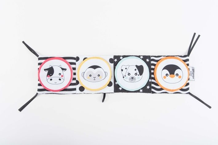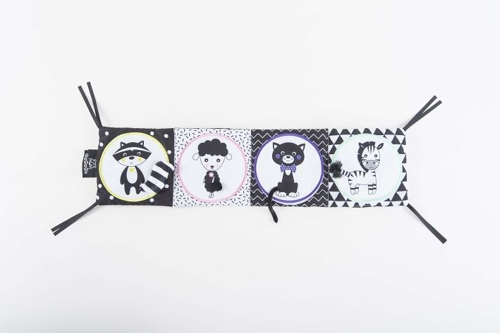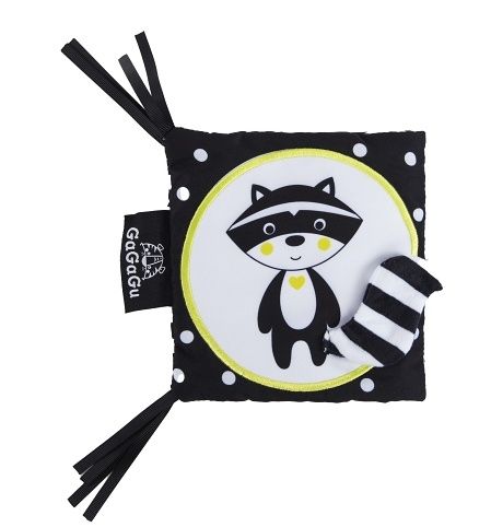 Smyslová knížka GaGaGu má kontrastní barvy a vzory, což stimuluje zrak dítěte. Kniha je oboustranná. Na jedné straně jsou kontrastní ilustrace zvířat s vyšívanými prvky, které jsou pro dítě pod prsty znatelně odlišné textury - stimulace hmatu, učení se různým texturám dítětem. Na druhou stranu jsou tu kulaté plyšové klapky, které dítěti umožní hrát jednu z oblíbených „her“ miminka – a kuku! - každá klapka je potištěna na obou stranách jiným vzorem - jeden prvek, ale dva zcela odlišné vizuální zážitky. Pod plyšovými klapkami s obrázky zvířátek jsou symboly jídla, co zvířátko jí + plyšové klapky mají všitý šustivý materiál a při otevírání a doteku šustí - menší dítě se učí různé tvary a barvy a dostává sluchovou stimulaci, starší dítě se dozví, jakou potravu dané zvíře jí. Hračka je velmi lehká a šikovná, snadno skladná, ideální na procházku nebo výlet. Bez plastových prvků lze díky stuhám připevnit na postýlku nebo kočárek.