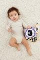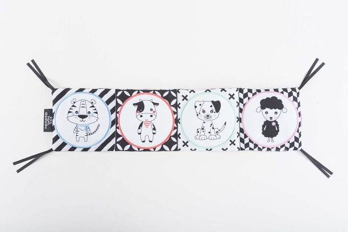 Smyslová knížka GaGaGu má kontrastní barvy a vzory, což stimuluje zrak dítěte. Kniha je oboustranná. Na jedné straně jsou kontrastní ilustrace zvířat s vyšívanými prvky, které jsou pro dítě pod prsty znatelně odlišné textury - stimulace hmatu, učení se různým texturám dítětem. Na druhou stranu jsou tu kulaté plyšové klapky, které dítěti umožní hrát jednu z oblíbených „her“ miminka – a kuku! - každá klapka je potištěna na obou stranách jiným vzorem - jeden prvek, ale dva zcela odlišné vizuální zážitky. Pod plyšovými klapkami s obrázky zvířátek jsou symboly jídla, co zvířátko jí + plyšové klapky mají všitý šustivý materiál a při otevírání a doteku šustí - menší dítě se učí různé tvary a barvy a dostává sluchovou stimulaci, starší dítě se dozví, jakou potravu dané zvíře jí. Hračka je velmi lehká a šikovná, snadno skladná, ideální na procházku nebo výlet. Bez plastových prvků lze díky stuhám připevnit na postýlku nebo kočárek.