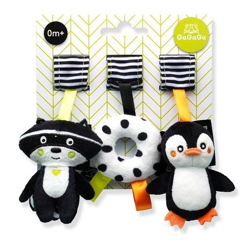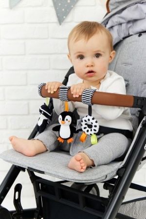 Plyšové hračky jsou odnímatelné - lze je jednotlivě připevnit na kočárek nebo na jiné produkty z kolekce (např. hrací podložka Panda)
