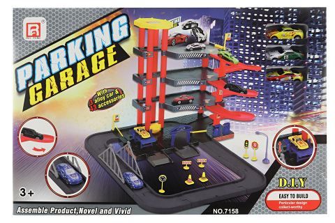 Třípatrová plastová garáž. Součástí balení jsou 3 kovová autíčka a 36 doplňků, jako např.značky. Baleno v krabici. Rozměry balení 52x35x7,5 cm. Věk 3+