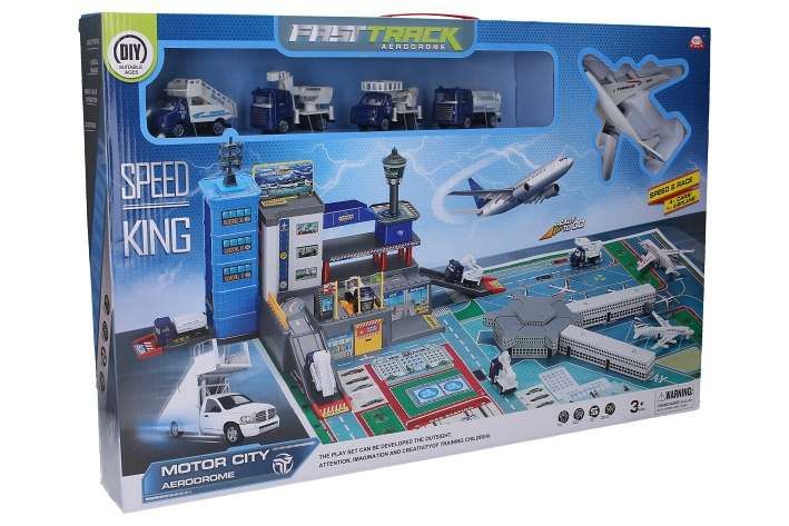 Garáž letiště set 4 auta a letadlo. Rozměry hrací plochy 87x60x30 cm. Obsahuje 4 kovová autíčka 7 cm (volná kola), a 1 kovové letadlo 13x13 cm.