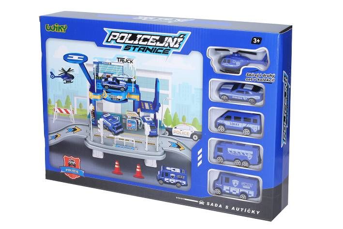 Garáž Policejní stanice s pumpou set. Rozměry stanice 65x19x24,5 cm. Obsah balení - garáž, 4xauto, 1x helikoptéra. Volná kola.