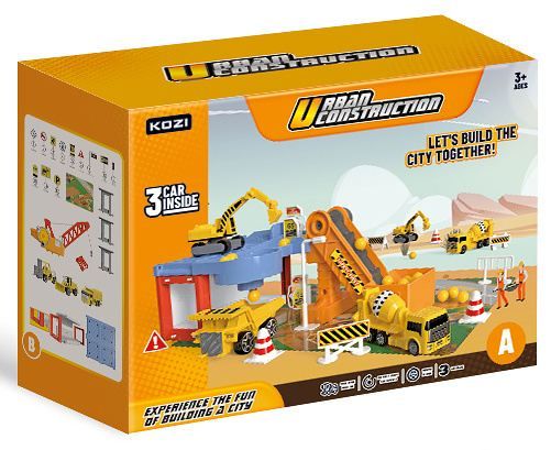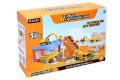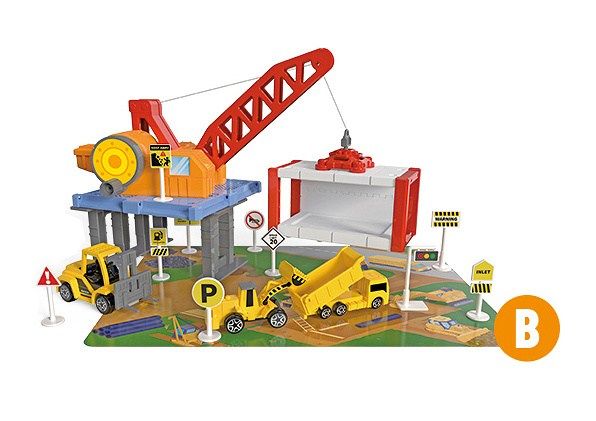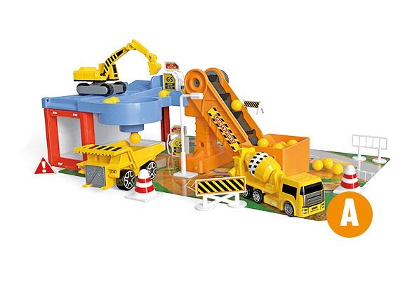 Obsahuje garáž, sklápěč, bagr, domíchávač, přepravní pás, značky.