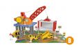 Garáž - stavební auta. Rozměry 26x19x11 cm. Obsahuje garáž, sklápěč, bagr, domíchávač, přepravní pás, značky.