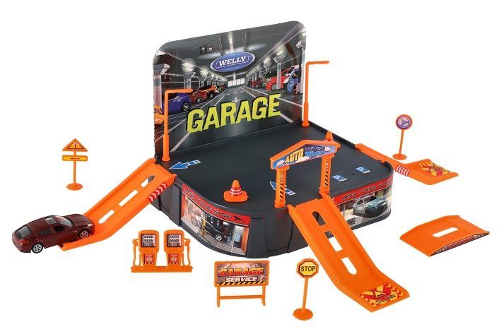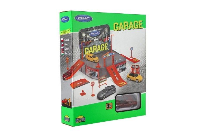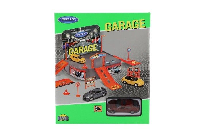 Balení obsahuje skládací garáž, tankovací pumpu, nájezdy, značky... Všechny díly si polepí samolepkami, které jsou součástí balení. Balení obsahuje i auto Welly Porsche.