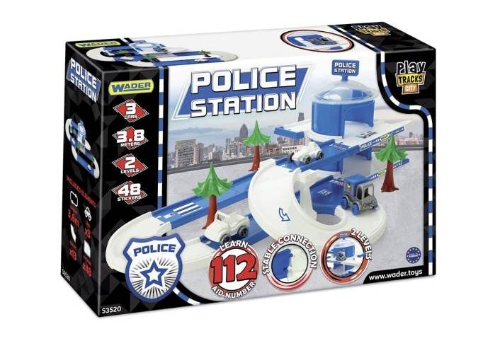 Dětská barevná dráha s policejní stanicí a autíčky. Délka dráhy je 3,8 m. Šířka dráhy pro autíčka (vnitřní průměr) je 9 cm. Součástí balení jsou 3 autíčka.