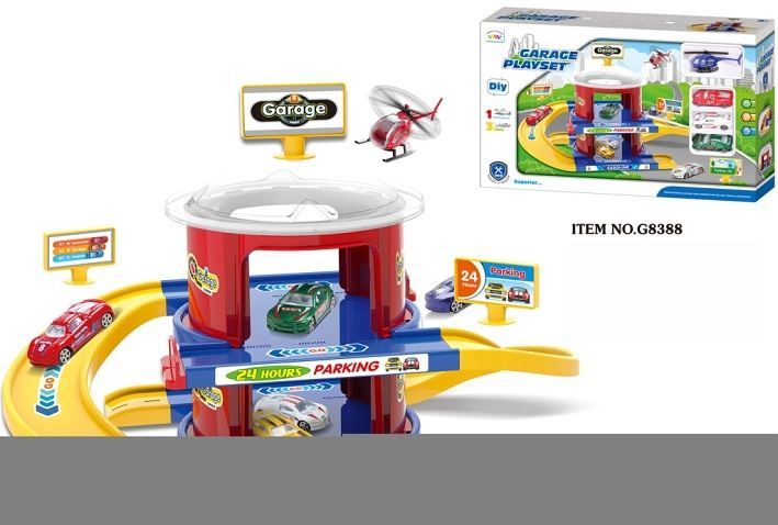 Garážové stání se 3 vozidla a 1 helikoptérou. Výrobek je vhodný pro děti od 3 let.