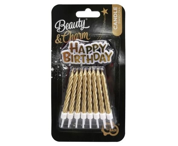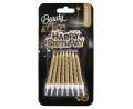 Zlaté dortové svíčky o délce 8 cm s podstavci a zlatým nápisem HAPPY BIRTHDAY. V balení 16 ks.