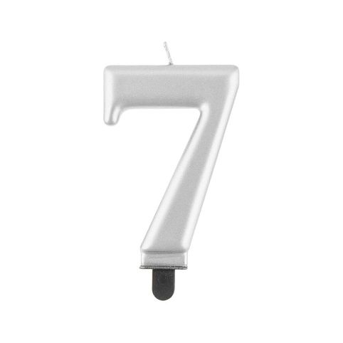 Stříbrná dortová svíčka č. 7 s metalickým leskem.