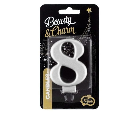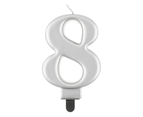 Stříbrná dortová svíčka č. 8 s metalickým leskem.