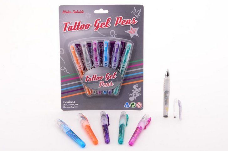 Gelová tetovací pera včetně šablon – 6 barev – modrá, oranžová, fialová, stříbrná, zelená a růžová.