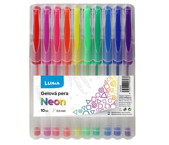 - hladké psaní- NEON gelová náplň- Šíře stopy 0,5 mm- průhledné tělo s uzávěrem- velká kapacita inkoustu- pogumovaný úchop