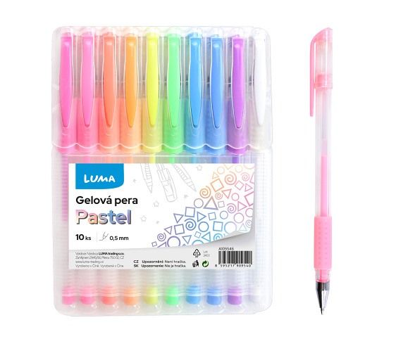 Hladké psaní- PASTEL gelová náplň- šíře stopy 0,5 mm- netoxické- průhledné tělo s uzávěrem- velká kapacita inkoustu- pogumovaný úchop