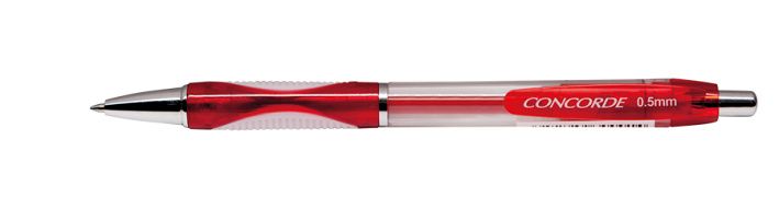 Gelové pero se stiskacím mechanismem a protiskluzovým gumovým úchopem. Jednorázová červená náplň. Průhledné tělo pro optickou kontrolu stavu náplně. Šíře hrotu 0,5 mm.