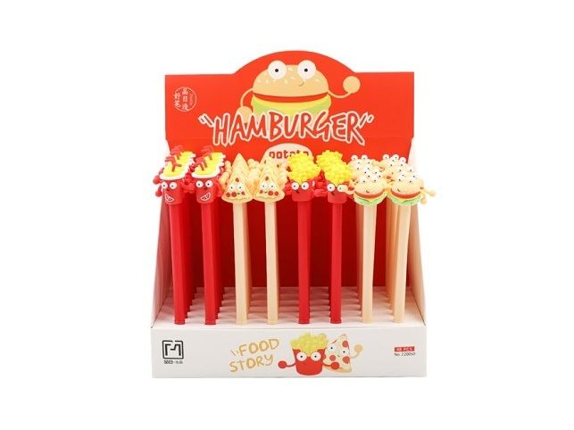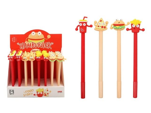 Gelové pero Fancy - Food Story s modrou náplní a hravými motivy oblíbených pochoutek, jako je pizza, hranolky, hamburger a nápoj. Obsahuje modrý inkoust a šíře stopy je 0,5 mm, což zajišťuje přesné a plynulé psaní.Pero je vybaveno víčkem pro ochranu hrotu před poškozením a má tělo z pružného, odolného plastu, příjemného na držení. Skvělý doplněk do školy, kanceláře nebo jako veselý dárek pro milovníky zábavných psacích potřeb. Hrot: 0,5 mm Barva: červená, béžová Počet kusů v balení: 48 ks Motiv: pizza, hranolky, hamburger, nápoj VAROVÁNÍ: Nevhodné pro děti do 3 let. Nebezpečí vdechnutí a spolknutí malých částic. Uvedená cena je za 1 ks.