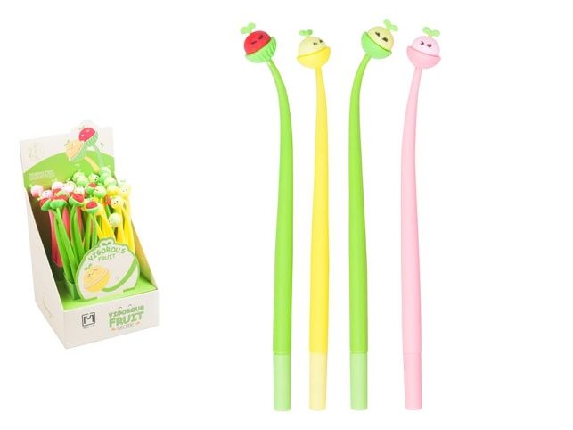 Zábavné gelové pero s motivy ovoce s modrou náplní. Pero má příjemný úchop a díky gelové náplni se s ním dobře píše. Motiv: ovoce Barva: 2 x zelená, žlutá, růžová Uvedená cena je za 1 ks.