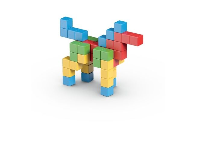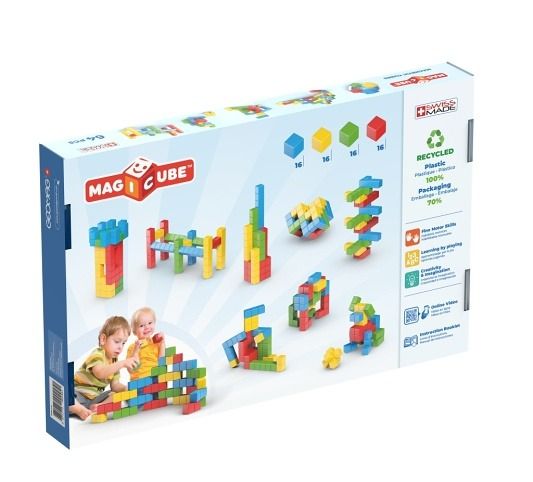 Díky speciální vnitřní konstrukci se magnetické kostičky přitahují ze všech šesti stran a drží i volně v prostoru - stavění ve 3D. Obsahuje 64 kostek ve čtyřech barvách. Vyrobeno ve Švýcarsku ze 100% recyklovaného plastu. Vhodné od 1 roku.