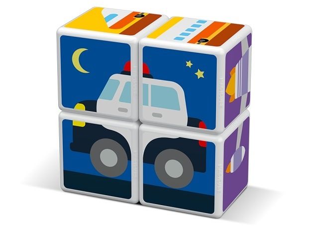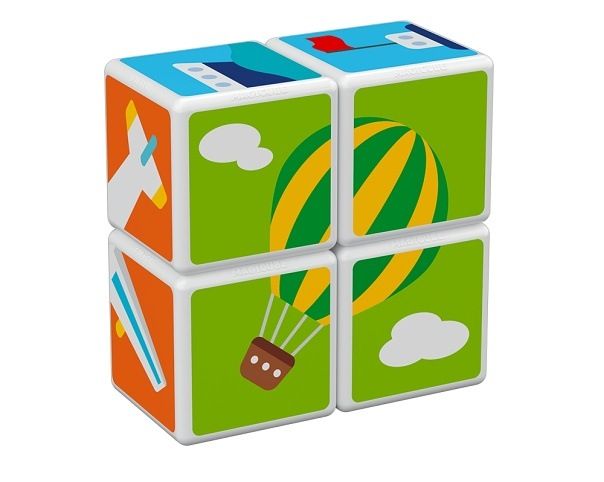 Výlet letadlem, vlakem nebo snad kosmickou raketou? Stačí si vybrat. Jednoduché spojování a otáčení zvládnou i ti nejmenší. Díky magnetkům uvnitř kostek krásně drží v prostoru, stavění ve 3D!!! Obsahuje 4 magnetické kostičky a 6 tipů na skládání (3 kartičky). Určeno pro děti od 1,5 roku.