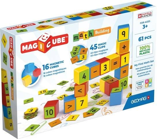 Vyzkoušejte domácí školu hrou s kostkami Geomag a pozorujte jak se Vaše ratolest učí, začíná rozlišovat číslice, tvoří první výpočty a skládá je pomocí magnetických klipů. Děti mají možnost vytvářet různé tvary, barevné kombinace a 3D struktury díky Geomag Magicubes, které jsou jedinečné v tom, že se přitahují a spojují ze všech stran. Sada obsahuje 16 magnetických kostiček ze 100% recyklovaného plastu a 45 magnetických klipů. Barevně jsou rozlišena sudá a lichá čísla, klipy jsou oboustranné. Stavebnice pomáhá při rozvoji kreativity, jemné motoriky a pomocí hry stimuluje zvědavost, hledání řešení a zkoumání systému magnetismu.Vhodné pro děti od 3 let.