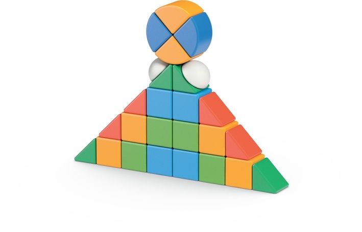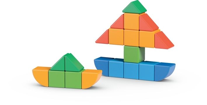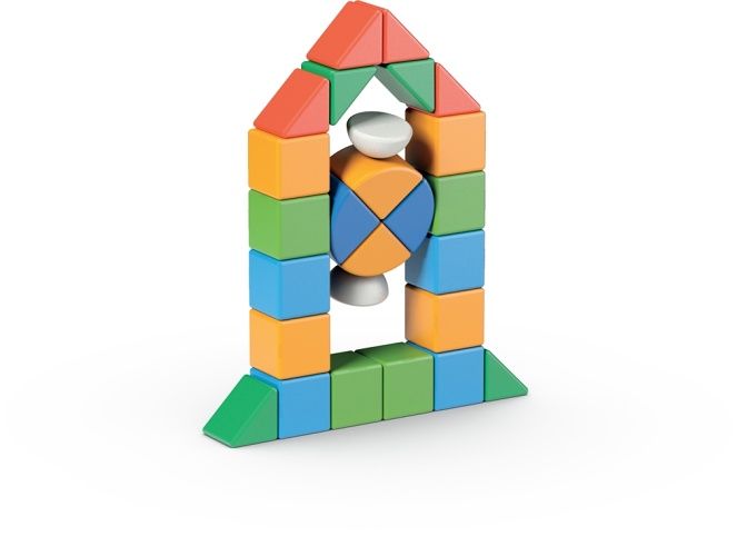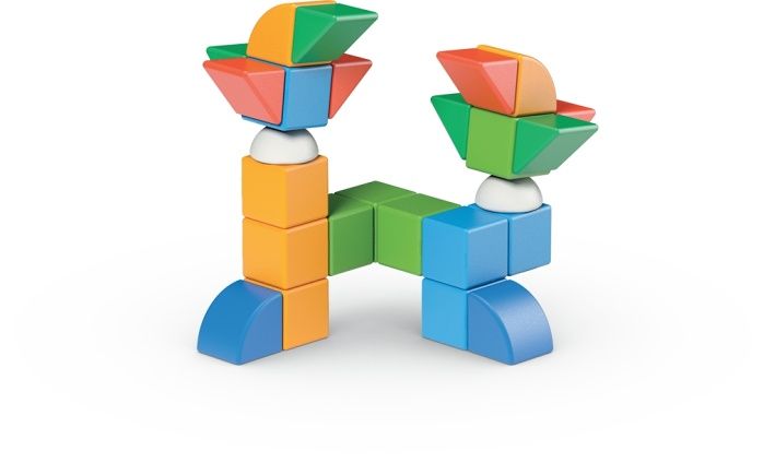 Kromě magnetických krychliček jsou součástí této sady také další tři magnetické tvary a čtyři kolečka. Obsahuje celkem 32 dílků. Vyrobeno ve Švýcarsku za použití recyklovaných plastů. Vhodné od 1 roku.
