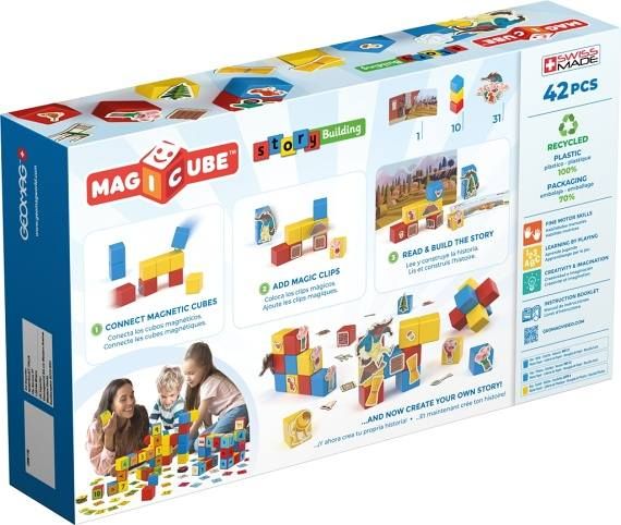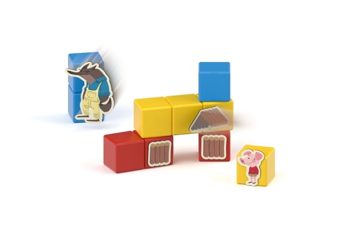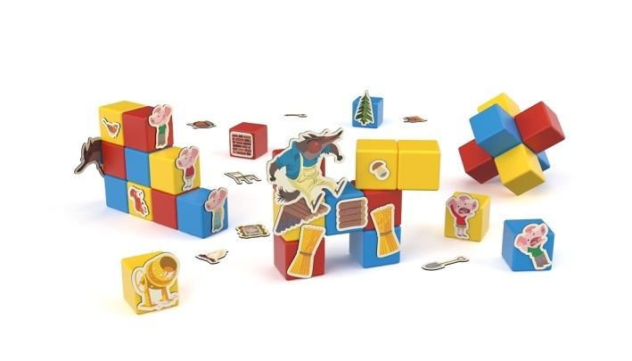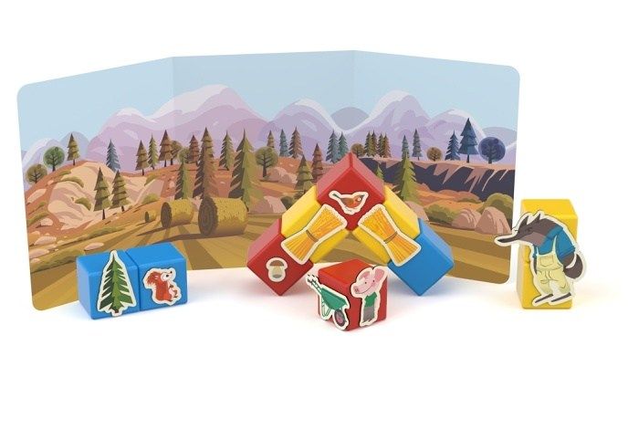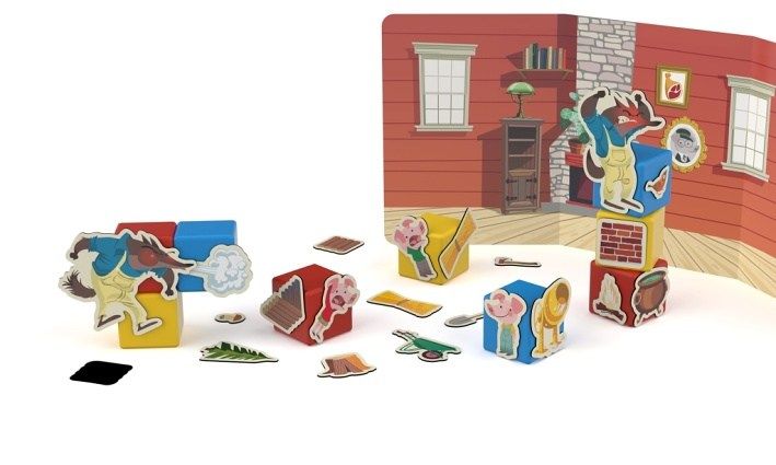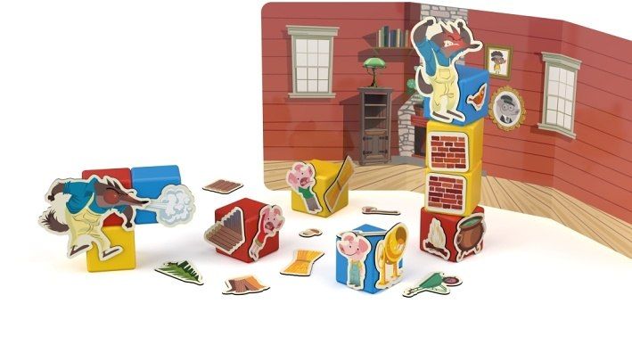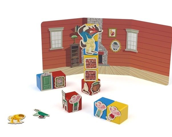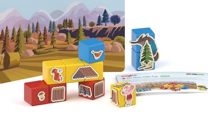 Rodiče čtou pohádku O třech malých prasátkách a děti ji přikládáním klipů k magnetickým kostičkám sami vytváří. Nebo můžete vymýšlet pohádky vlastní. Součástí je text v češtině a slovenštině. Obsahuje 10 magnetických kostek, 31 klipů s obrázky a oboustrannou kartu s motivem domu a lesa. Vyrobeno ze 100% recyklovaného materiálu. Vhodné pro děti od 3 let.