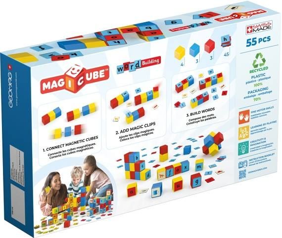 Vyzkoušejte domácí školu hrou s kostkami Geomag a pozorujte, jak se Vaše ratolest učí, začíná rozlišovat písmena, vytváří první slova a skládá je pomocí obrázků. Děti mají možnost vytvářet různé tvary, barevné kombinace a 3D struktury díky Geomag Magicube, které jsou jedinečné v tom, že se přitahují a spojují ze všech stran. Sada obsahuje 10 magnetických kostiček ze 100% recyklovaného plastu a 45 klipů. Barevně jsou odlišeny samohlásky a souhlásky, klipy jsou oboustranné. Stavebnice pomáhá při rozvoji kreativity, jemné motoriky a pomocí hry s písmeny a obrázky stimuluje zvědavost, hledání řešení a zkoumání systému magnetismu. Vhodné pro děti od 3 let.