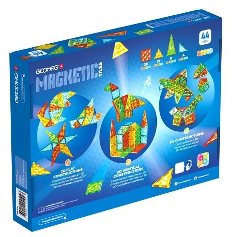 Geomag Magnetic Tiles 44 dílků obsahuje magnety na všech stranách jednotlivých tvarů. Lze tak snadno vytvářet jakékoliv 2D obrazce nebo 3D struktury. Stavebnice rozvíjí manuální zručnost, kreativitu a fantazii, učí barvy, geometrické tvary, ale hlavně si s ní děti užijí spoustu zábavy. Obsahuje 44 průhledných strukturovaných dílků ve čtyřech barvách – 20 čtverců, 12 rovnostranných trojúhelníků, 8 rovnoramenných trojúhelníků a 4 pravoúhlé trojúhelníky. Vhodné od 3 let.